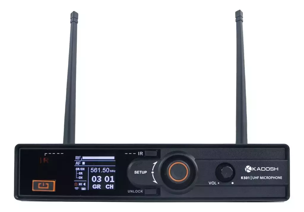 O K501 possui PLL – Phase Locked Loop, escaneamento de frequência, sync por IR (impulse response) e True Diversity. As antenas são omnidirecionais com ¼ de comprimento de onda e conexão BNC. Compatível com distribuidores de antena.